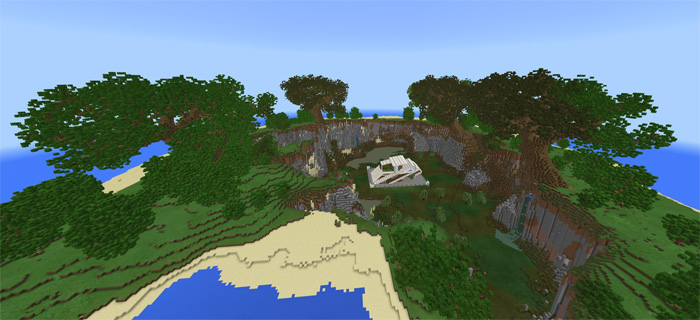 Esta mansión está construida en un terreno pantanoso personalizado que en realidad es una pequeña isla en un gran océano. El área que rodea la mansión incluye objetos personalizados como enormes árboles. Es genial usarlo como un mapa de supervivencia en caso de que quieras vivir en un lugar más elegante que tu casa de tierra ordinaria para sobrevivir la primera noche.